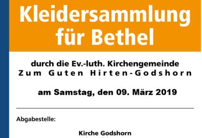 Die Brockensammlung Bethel nimmt am Samstag, 09. März 2019 im Seitenschiff unserer Kirche von 9:00 – 18:00 Uhr gerne Kleiderspenden entgegen. In etwa 4.500 Kirchengemeinden im gesamten Bundesgebiet finden regelmäßig Kleidersammlungen für Bethel statt.