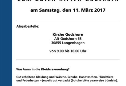 Die Brockensammlung Bethel nimmt am 11. März 2017 gerne Kleiderspenden entgegen. In etwa 4.500 Kirchengemeinden im gesamten Bundesgebiet finden regelmäßig Kleidersammlungen für Bethel statt. Die in den Kirchengemeinden und Sammelstellen abgeholte Kleidung wird überwiegend an Fachsortierbetriebe verkauft und dort sortiert.