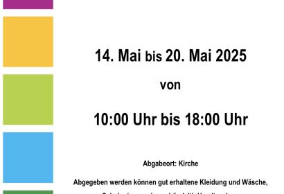 In der Zeit vom 14.5. bis 20.5. sammeln wir in unserer Gemeinde gebrauchte, gut erhaltene Kleidung usw. für Bethel.