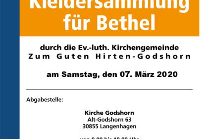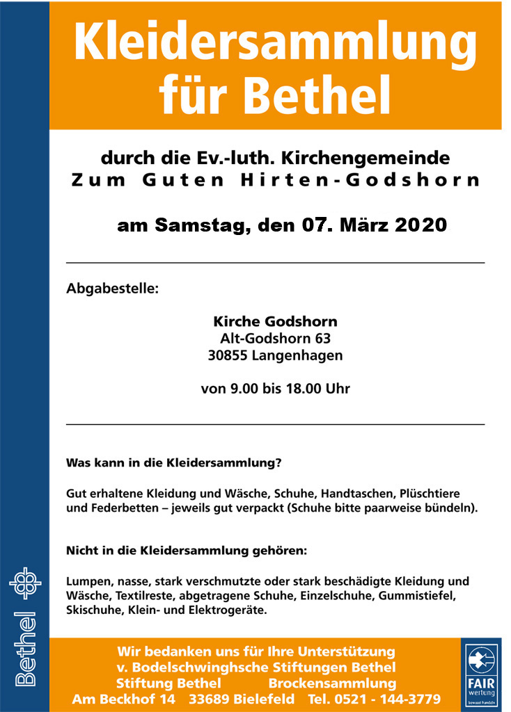 Bitte bringen Sie die Altkleider nur in der angegebenen Zeit dorthin, denn der Abtransport nach Bethel erfolgt sofort nach Abschluss der Sammlung.